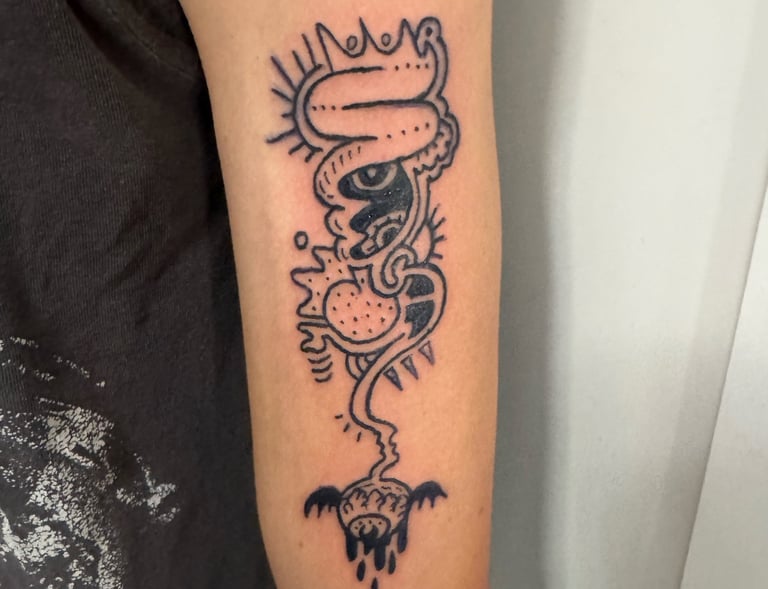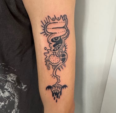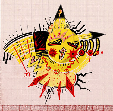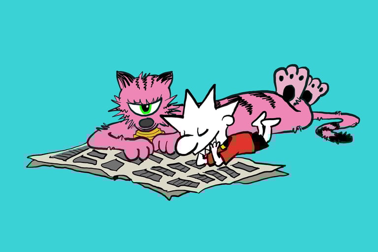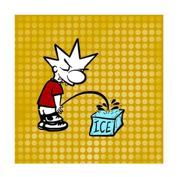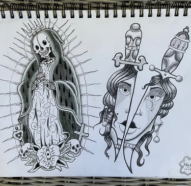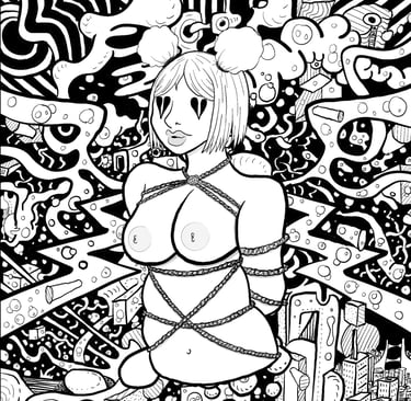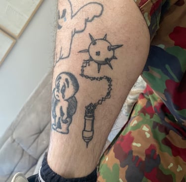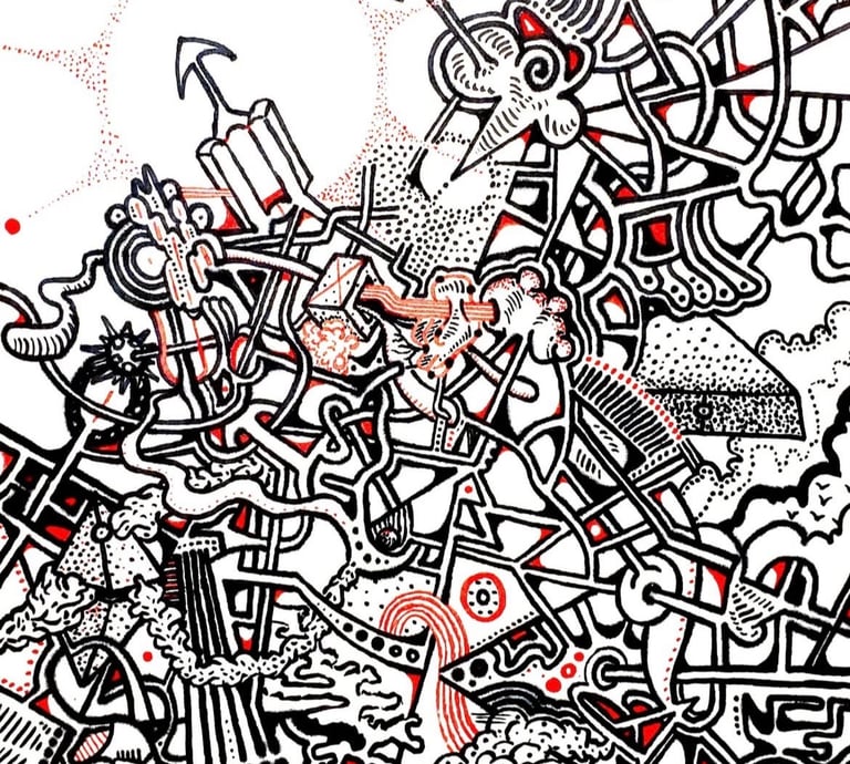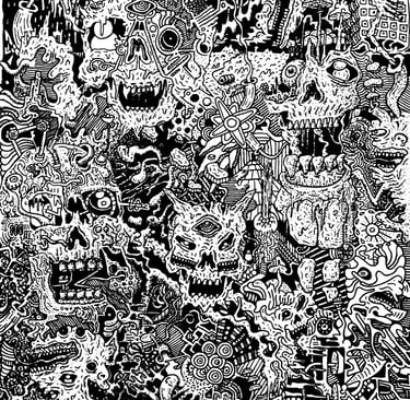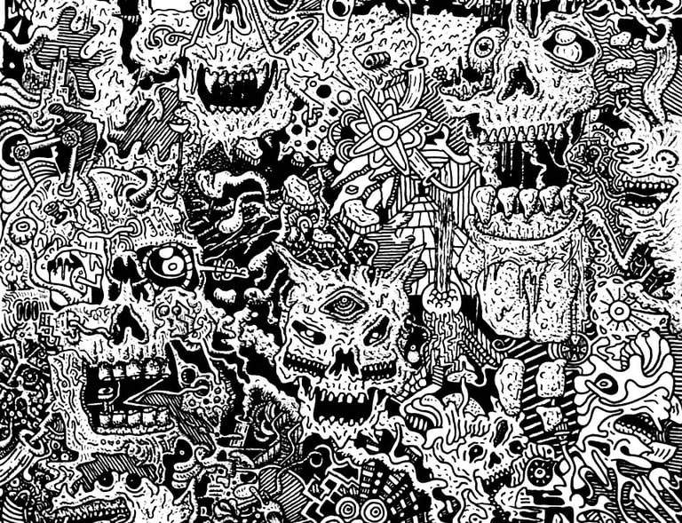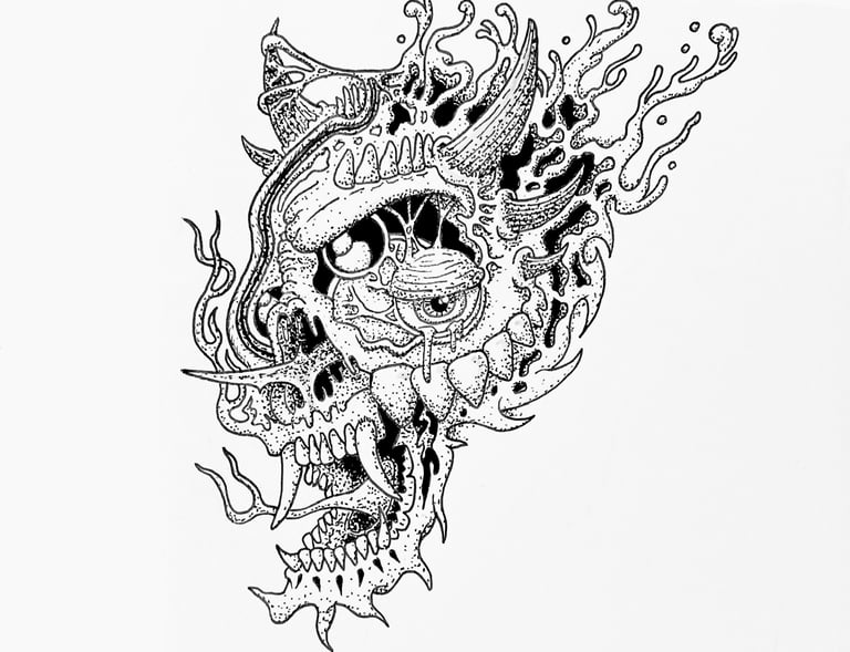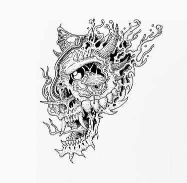 He blends quirky cartoons with dark, moody vibes to create art that’s both fun and edgy.