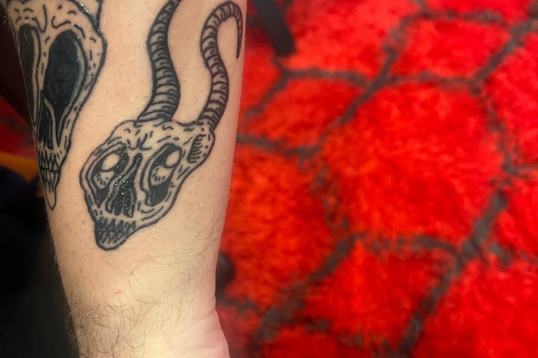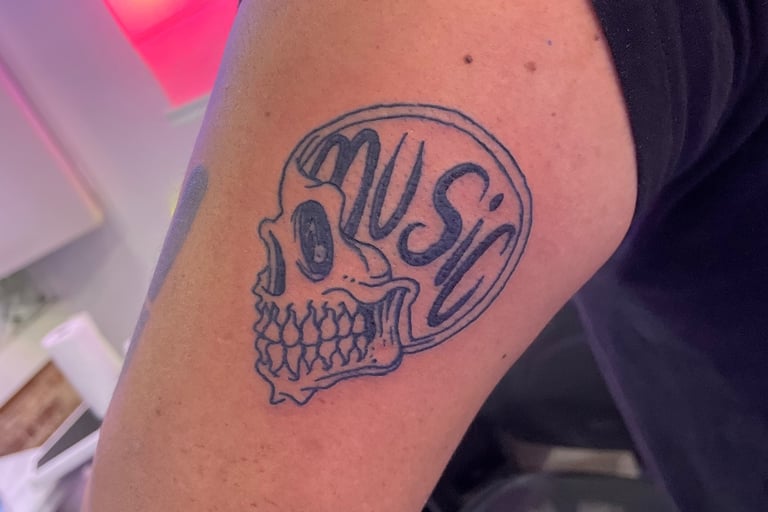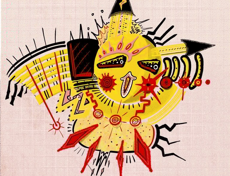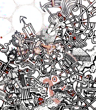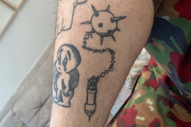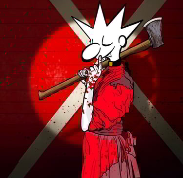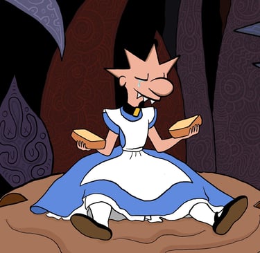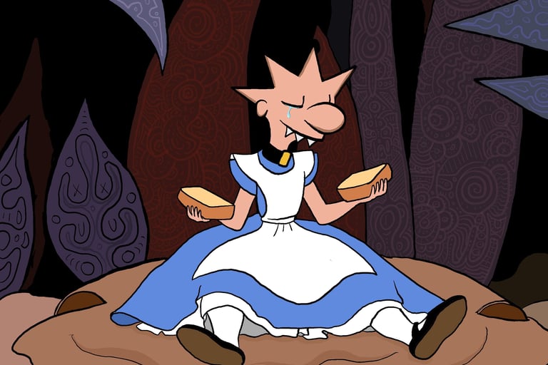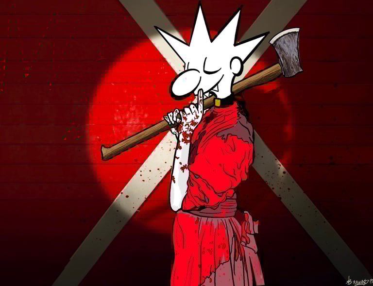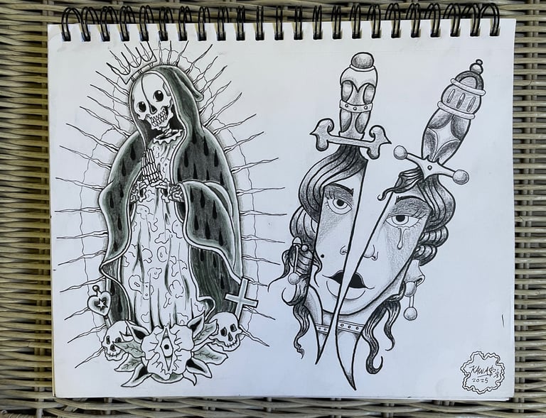 He blends quirky cartoons with dark, moody vibes to create art that’s both fun and edgy.